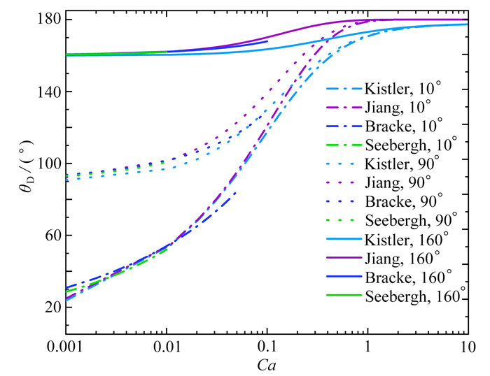 摘要: 基于计算流体力学(CFD)模拟液滴冲击壁面,对于理解液滴在固体壁面铺展的动力学行为有重要的意义,可以为超疏水结构设计及防除冰涂层开发提供技术支撑,其中的难点在于如何在模型中准确刻画接触线及动态接触角的演化过程. 总结了四种典型的动态接触角模型,从理论上分析了其应用范围,借助FLUENT中的UDF功能,将动态接触角模型应用于壁面边界条件. 首先对液滴冲击光滑壁面的动力学过程进行了数值模拟研究,通过定量分析液滴形态的各项参数变化并与实验结果对比表明,Seebergh动态接触角模型更适用于模拟低毛细数下液滴的运动,Kistler模型与Jiang模型应用范围更广并且可以较准确地描述高毛细数下液滴的运动. 随后基于Kistler动态接触角模型,对液滴在微结构表面的冲击与铺展过程进行了仿真研究,发现应用动态接触角模型会导致液滴内部流场在表面张力起主导作用的阶段内发生变化,并且在平衡状态下液滴接触角的模拟值与理论值相近.Abstract: The simulation of droplet-wall impact process based on computational fluid dynamics (CFD) is of great significance for understanding the dynamic behavior of droplets spreading on the solid wall, and can provide technical support for the design of superhydrophobic structures and the development of anti-icing coating. The difficulty lies in how to accurately describe the evolution process of the contact line and the dynamic contact angle in the model. Herein, 4 typical dynamic contact angle models were summarized, and their application ranges were analyzed theoretically. With the UDF function in FLUENT the dynamic contact angle model was applied to the wall boundary conditions, and the dynamic process of droplet impact on smooth wall was numerically simulated. The quantitative analysis of the changes of droplet shape parameters and the comparison with the experimental results show that, the Seebergh dynamic contact angle model is more suitable for simulating the motion of droplets with lower capillary numbers. The Kistler model and the Jiang model are more widely used and can accurately describe the motions of droplets with higher capillary numbers. Then, based on the Kistler dynamic contact angle model, the impact and spreading processes of droplets on the microstructure surface were simulated. It is found that, the application of the dynamic contact angle model will lead to the change of the internal flow fields of droplets with the surface tension playing a dominant role, and the simulated droplet contact angle value in equilibrium is close to the theoretical value.